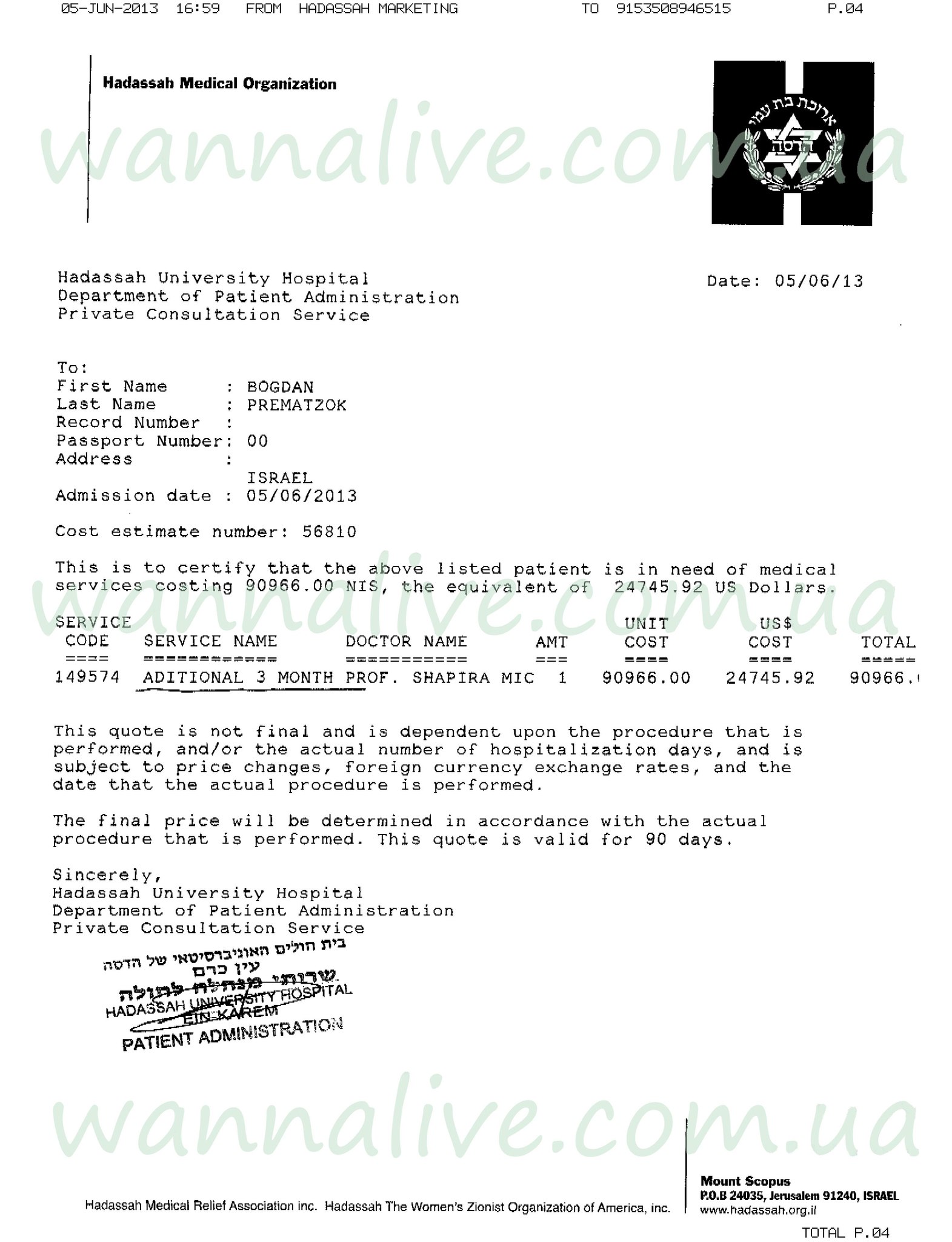 Второй вопрос задавался долго. Обсуждался долго. На него отвечали максимально подробно. И не один раз. И что самое важное, ответ на этот вопрос четко подтверждается официальным документом из клиники. Поиск донора есть неотъемлемой частью аллогенной неродственной трансплантации костного мозга. Сама трансплантация – это сложное, комплексное лечение, где непосредственно сама трансплантация – это самое быстрое и простое. Есть такое условное понятие, как базовый пакет ТКМ – это все те процедуры, которые необходимы абсолютно для каждого пациента проходящего этот сложный путь лечения. В него входят – hla анализ крови пациента или типирование, с помощью которого ищут максимально совместимого донора для трансплантации, непосредственно сам поиск донора, комплексные анализы абсолютно всего организма пациента, проверка работы внутренних органов, поддерживающее лечение по результатам этих анализов – подготовка организма к дальнейшей борьбе после трансплантации, химия, сама трансплантация, обязательный трехмесячный период госпитализации. Время после трансплантации – самый тяжелый и опасный период, и каждый человек, прошедший ТКМ знает это. После химии, которая необходима для того, чтобы уничтожить собственный костный мозг, человек остается без иммунитета. Все вирусы, которые в организме здорового человека подавляются и сдерживаются иммунной системой, начинают атаковать организм со всех сторон. Эта самая большая опасность при трансплантации и врачам до сих пор очень сложно ее контролировать и справляться с ней. Помимо вирусов донорский костный мозг должен прижиться и заработать. Чем выше совместимость пары донор-реципиент, тем больше вероятность, что костный мозг «научится» работать в новом организме и подружиться с ним. Этот период может занять от нескольких месяцев до нескольких лет, и все равно существует угроза, что этого не произойдет. Пока донорский костный мозг учится работать и вырабатывать клетки крови, которые должны обеспечить организм необходимыми эритроцитами, лейкоцитами и тромбоцитами, его подавляют теми самими препаратами, которые должны справиться с бушующими вирусами. Все это должен выдержать организм, который уже был подвергнут тяжелой химии непосредственно перед трансплантацией. Я пишу это подробно с одной целью – объяснить, что трансплантация должна включать все эти этапы и никак по-другому это быть не может, все они важны и неразрывны, и все они называются трансплантацией костного мозга. Общая стоимость трансплантации составляет около 210 тысяч долларов США, сумма долларах может колебаться в зависимости от курса израильского шекеля по отношению к американскому доллару. Этот счет нам выставили в виде двух документов: первый — счет на депозит, который включает hla тест, поиск донора, обследование пациента и саму трансплантацию. Слово депозит, которое четко прописано именно в такой формулировке, означает то, что указанная сумма за перечисленные процедуры, а это около 185 тысяч долларов, должна быть перечислена, до их начала. Остаток суммы за госпитализацию, важность, которой я описала раннее, можно перечислить позже, так как анализы, поиск донора, проверки займут определенное время. Желательно вообще всю сумму внести сразу, потому что перерыв на любом этапе может стоять пациенту жизни. Особенно на э